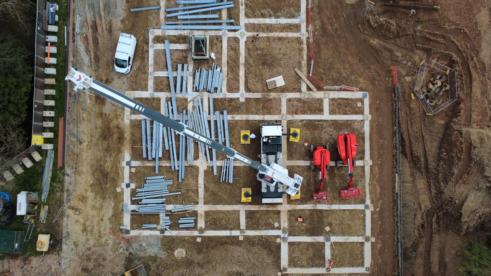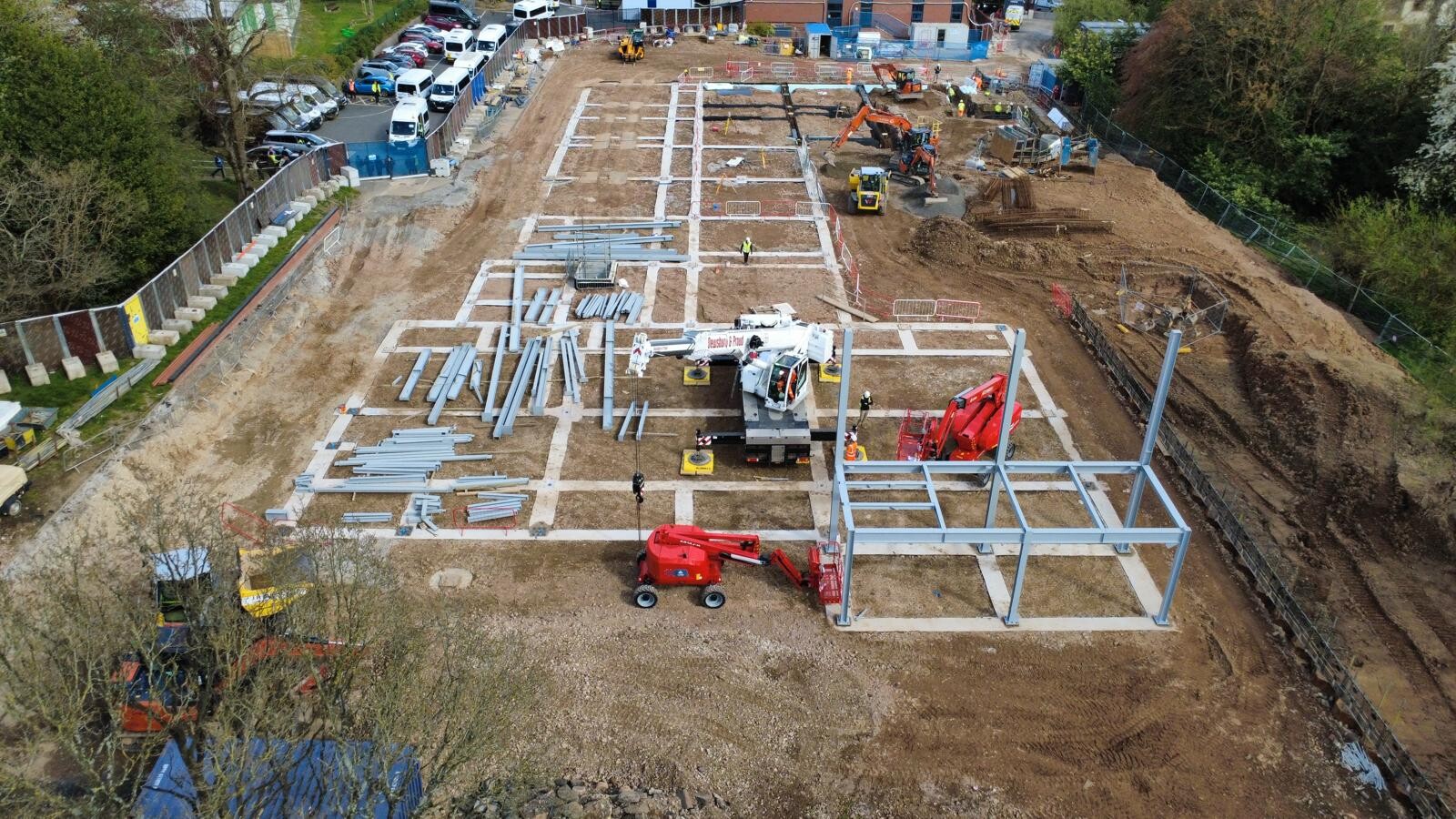The ground beams are now complete, and the steel framework is starting to go up across the site. Over the coming weeks, more steel will continue to be erected and the building will start to take its full form as the structure rises higher.