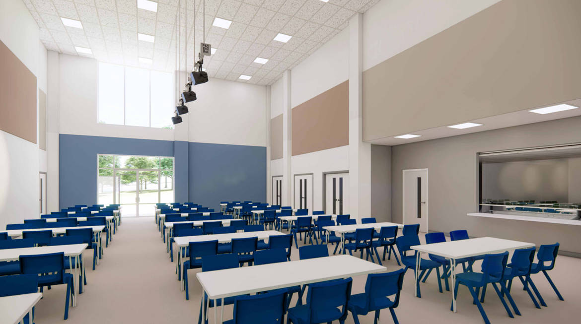 At the heart of the school is a generous double-height assembly hall seating over 100 pupils — a space for whole-school gatherings, performances, and events. It includes stage lighting, direct access to outdoor space, and an adjacent servery so it can also function as the school's dining hall.